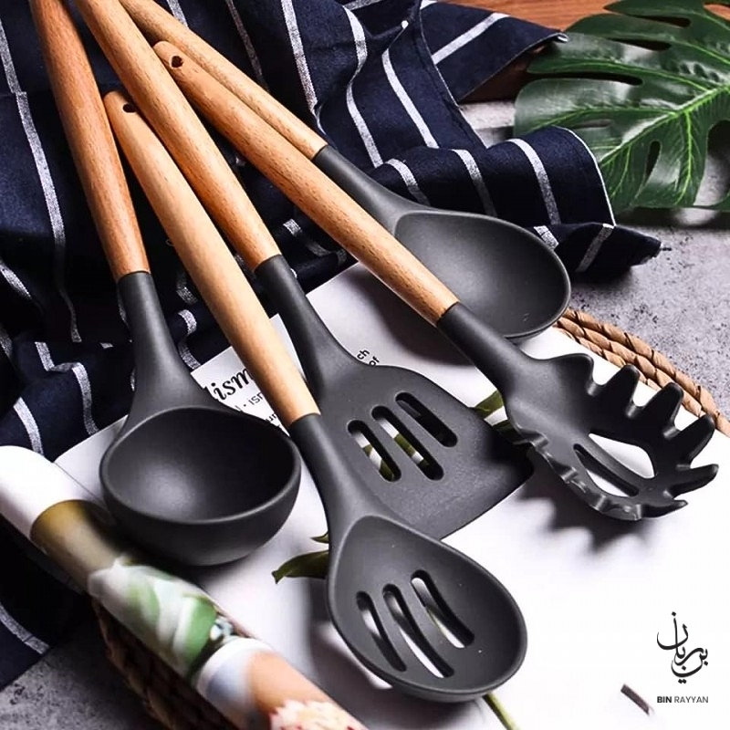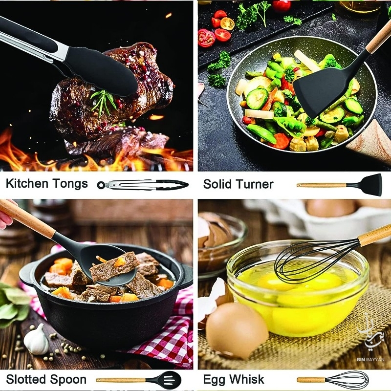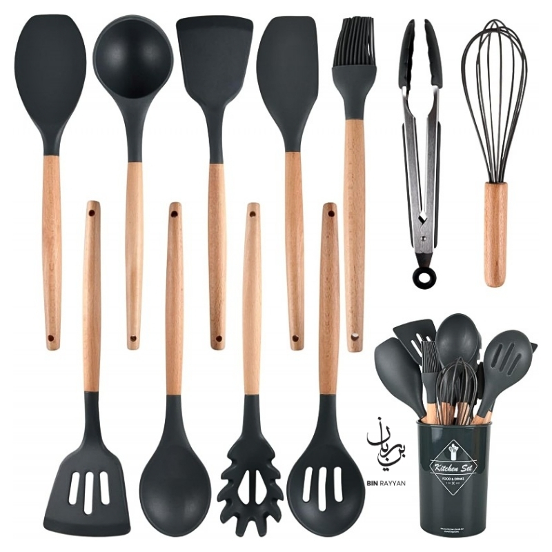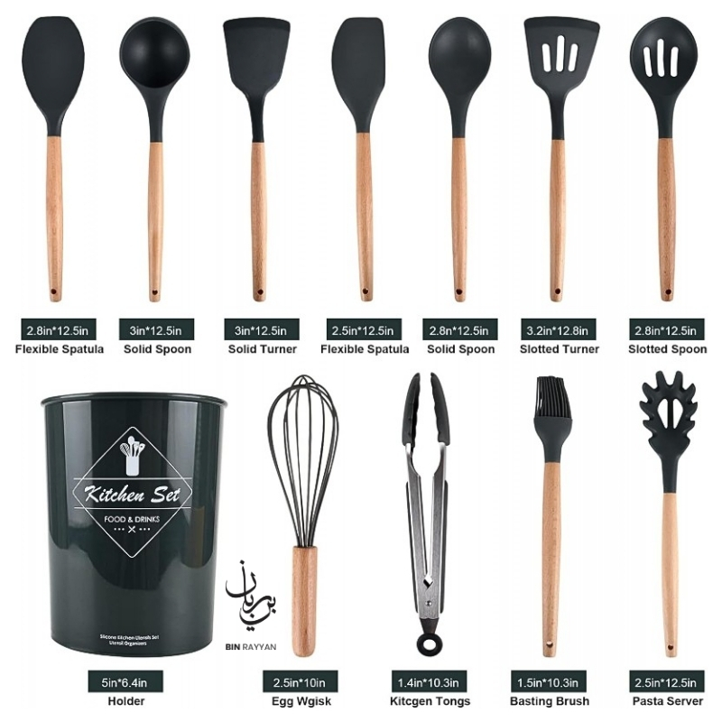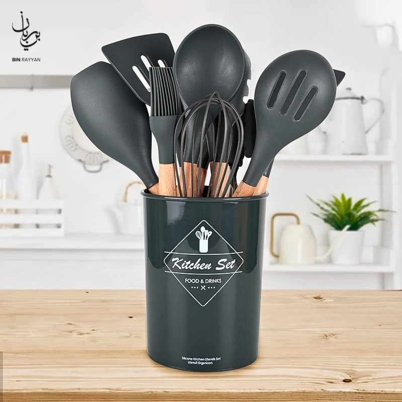 This versatile set includes essential tools such as spatulas, spoons, tongs, whisk, and more, making it ideal for frying, mixing, serving, and baking. With heat resistance up to high temperatures, these utensils perform reliably during intense cooking sessions. The included storage cup keeps your kitchen organized, while the easy-to-clean material ensures hassle-free maintenance. A perfect addition to your cooking essentials, this BinRayyan recommended kitchen set blends functionality, durability, and elegant design for everyday use.